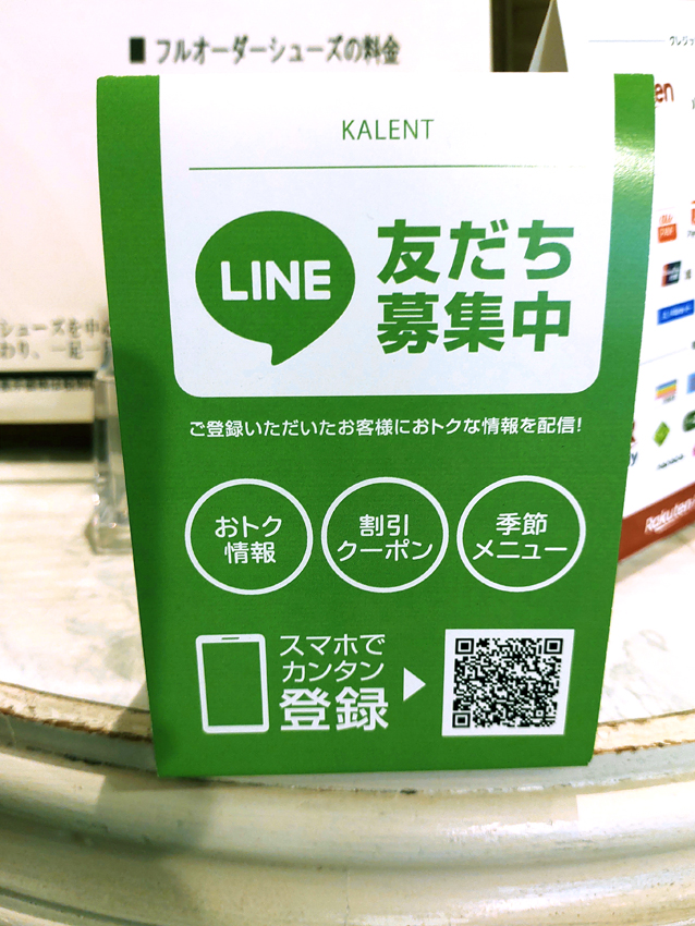 只今、LINEのお友達登録をしていただきましたお客様に、オーダー靴のご注文いただいた際に使えるクーポン券をプレゼントしております。