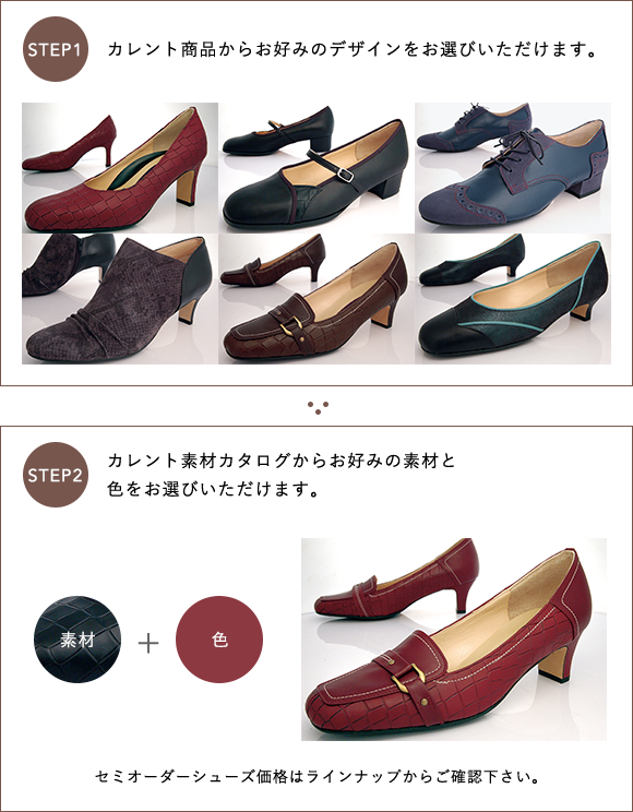 A1:セミオーダーは足の採寸を行わず、当店のサンプルシューズをご試着頂いて、デザインとサイズを決めて頂きます。色やヒールの高さ、ヒールの形などはお選びいただけます。