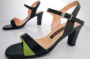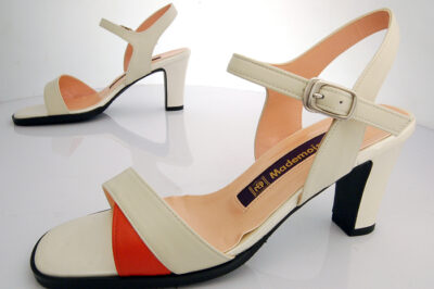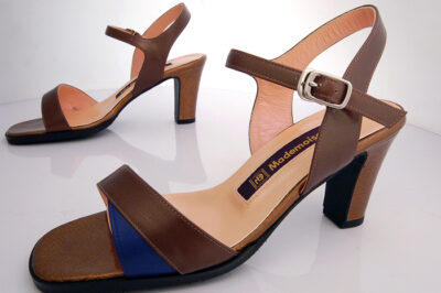 シンプルでスタイリッシュな7㎝ヒールのサンダルです。こういったサンダルは小指に負担がかかりやすいので、アクセントも兼ねて外側を広くしてあります。