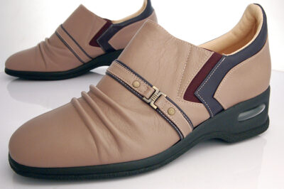クッション性のあるエアソールを使用したサイドゴアスリップオンです。カカトの切り替えとベルトの配色に拘った一足になります。