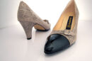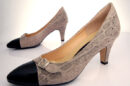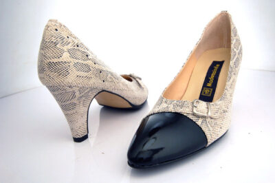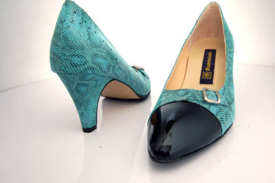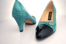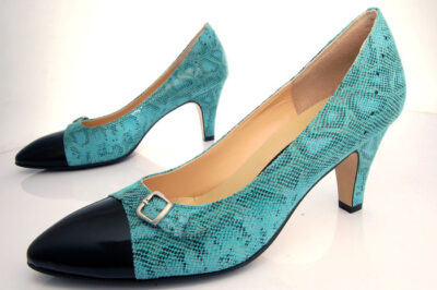 ヘビ柄をメインにつま先の黒エナメルでエレガントな印象のポインテッドトゥパンプスです。ヒールは少し太めの7cmヒールです。